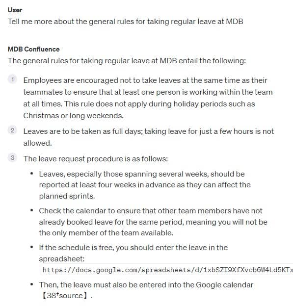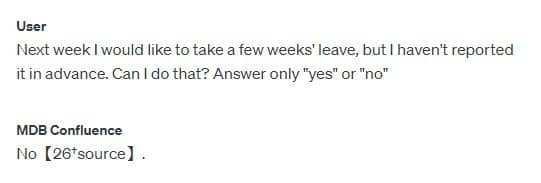This is, of course, an extreme example of a small but annoying issue. To better illustrate what exactly this chatbot can do, based on the company's internal knowledge, I am attaching a few screenshots with examples of questions and answers below.
